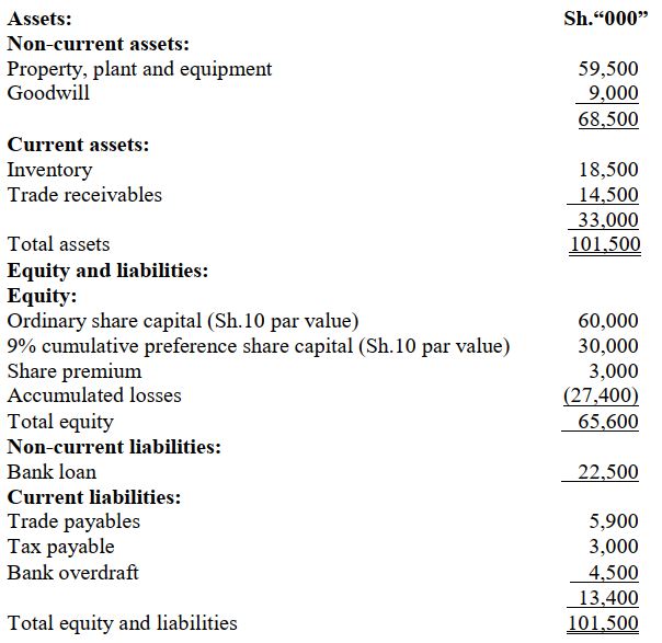 4. The preference dividends in Tanga Limited were three years in arrears and the preference shareholders forfeited half of the preference dividend arrears. The balance was fully settled the new company issuing ordinary shares of Sh.10 each.
