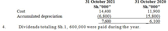 2. Equipment with an original cost of Sh.1,700,000 and a net book value of Sh.900,000 was sold for Sh.640,000 during the year ended 31 October 2021.
