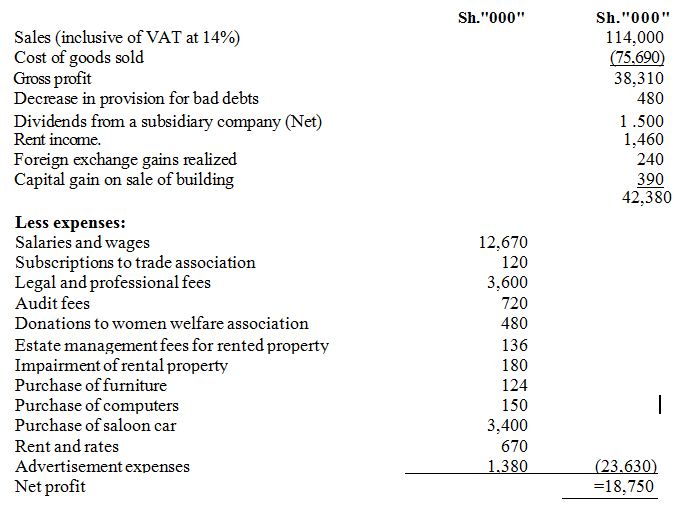 • Rent income Sh.280,000 net of purchase of furniture Sh.40,000 and cost of advertising vacant houses for Sh.24,000.
