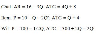 Agro manufacturers produce three products; Chat, Item and Wit (in thousands) whose demand and cost functions are given as follows: